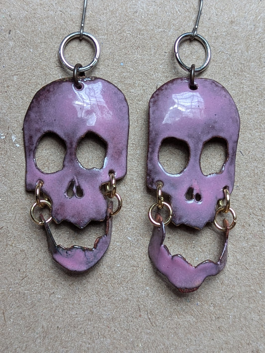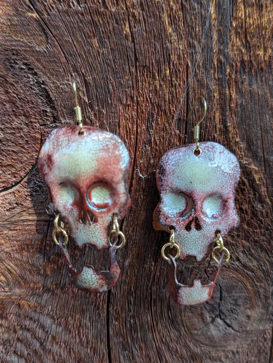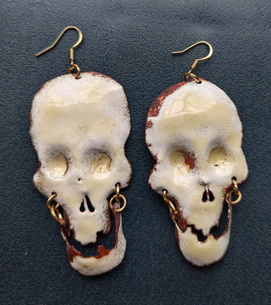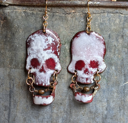 Skull earrings: handmade, torch fired enamel, swinging jaws, one of a kind