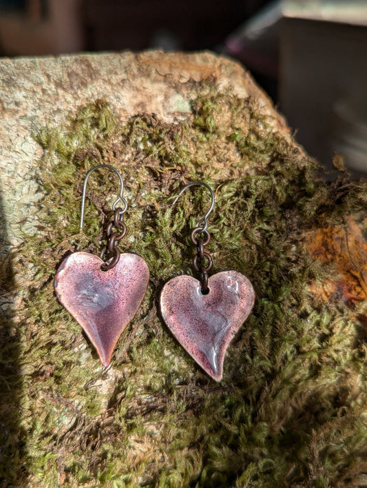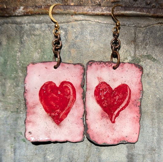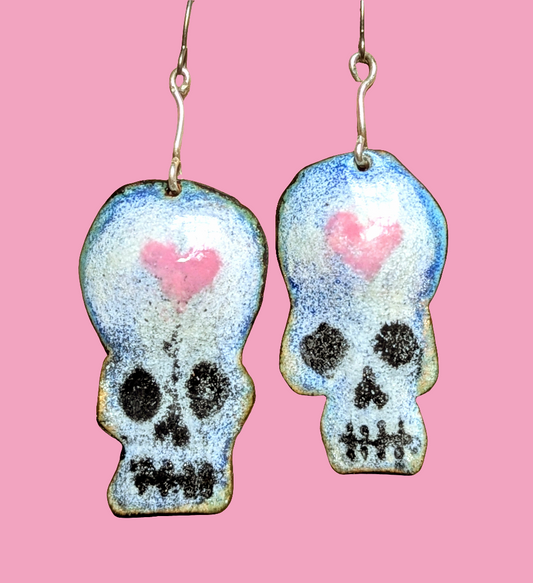 SOLD: I can make you a similar pair. Send me a message if you're interested. Turn around is 2 weeks to one month currently. Heart Skulls, because love matters and life is short. Enameled copper.