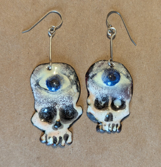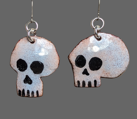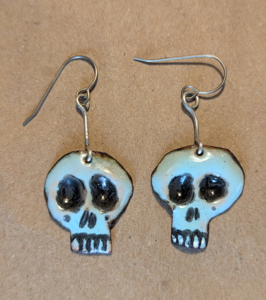 SOLD: I can make you a similar pair. Send me a message if you're interested. Turn around is 2 weeks to one month currently. Super cute Skully earrings. Enameled copper with sterling silver accent wire.