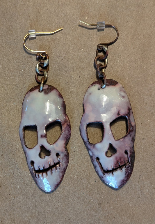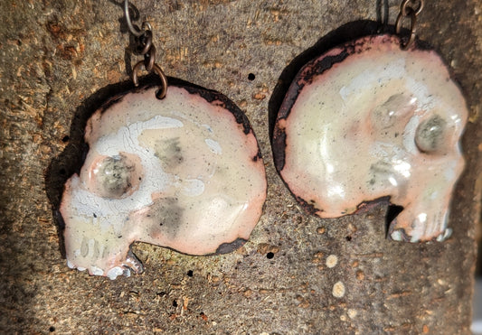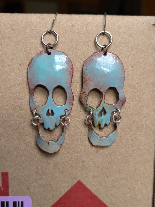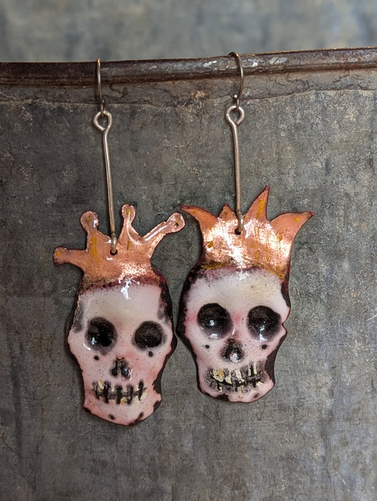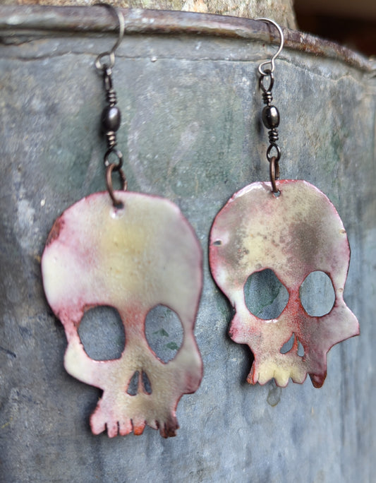 Skully earrings in translucent enamel letting the brushed copper shine through.