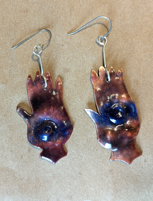 Eye palm earrings. Wards against the evil eye. Hand formed, enameled copper