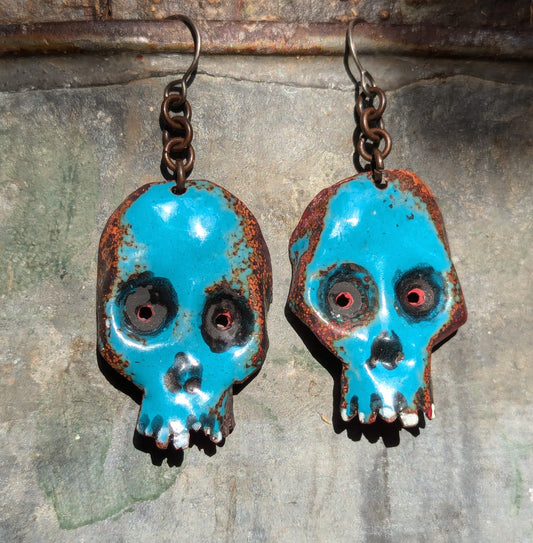 Skully earrings with halo and flair for days. Enameled hand formed copper with moving jaws